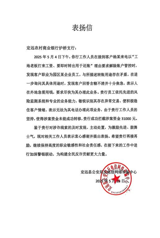 5月19日,定远县公安局反诈中心发来表扬信,对于定远农商银行炉桥支行在打击电信网络诈骗工作中,表现出的高度的职业敏感性和社会责任感提出表扬,希望定远农商银行继续主动作为,深化警银协作,为全民反诈构建金融防护网。
